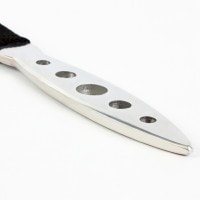Aluminum Practice Knife Trainer with Holesアルミの金属製トレーニング用ナイフで、刃はついていません。刃が厚く、斬れたり刺さったりしないような加工が施されています。刃の部分はメッキ仕上げになっています。カリ/シラット/エスクリマ/アーニス系の武術トレーニングで好まれる練習用ナイフです。ジークンドーやインドネシアのシラットでも同様のナイフを練習でも使われています。練習用に作られただけあり、使い勝手が良く考えられた仕上がりになっています。肌をなぞっても、引っかかりはありません。先が丸みがあり、刃の厚みが当ラインナップの中で最も厚く、かつブレードに穴があいている為に、精神的な圧迫感が少なくなっています。穴があいている事で、手元にナイフの重心がくるため、持った際の重量バランスも優れています。注意: こちら商品はダイカスト製(型に流し込むタイプ)です。穴があいているために接続部の面積が狭く、ハードな練習には向かないため、ハードユーズの場合には、